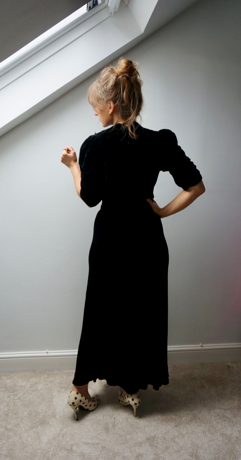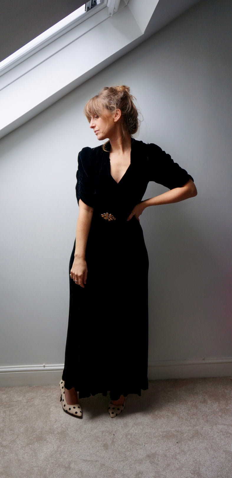 Black vintage stretch velvet dress with jewelled buckle belt.