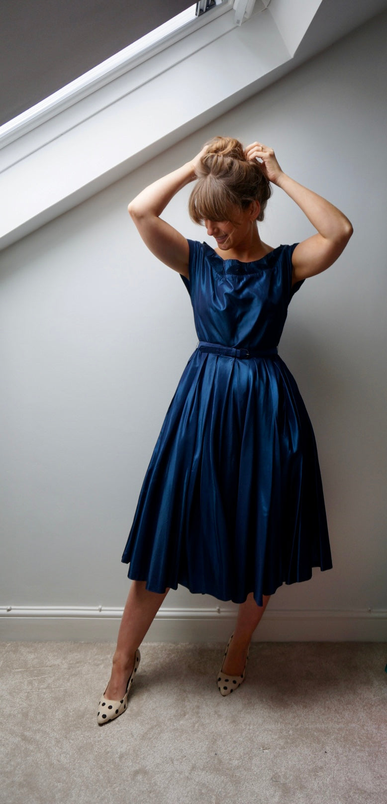 Deep blue 1950s dress with scallop edge necklace and belted waist.